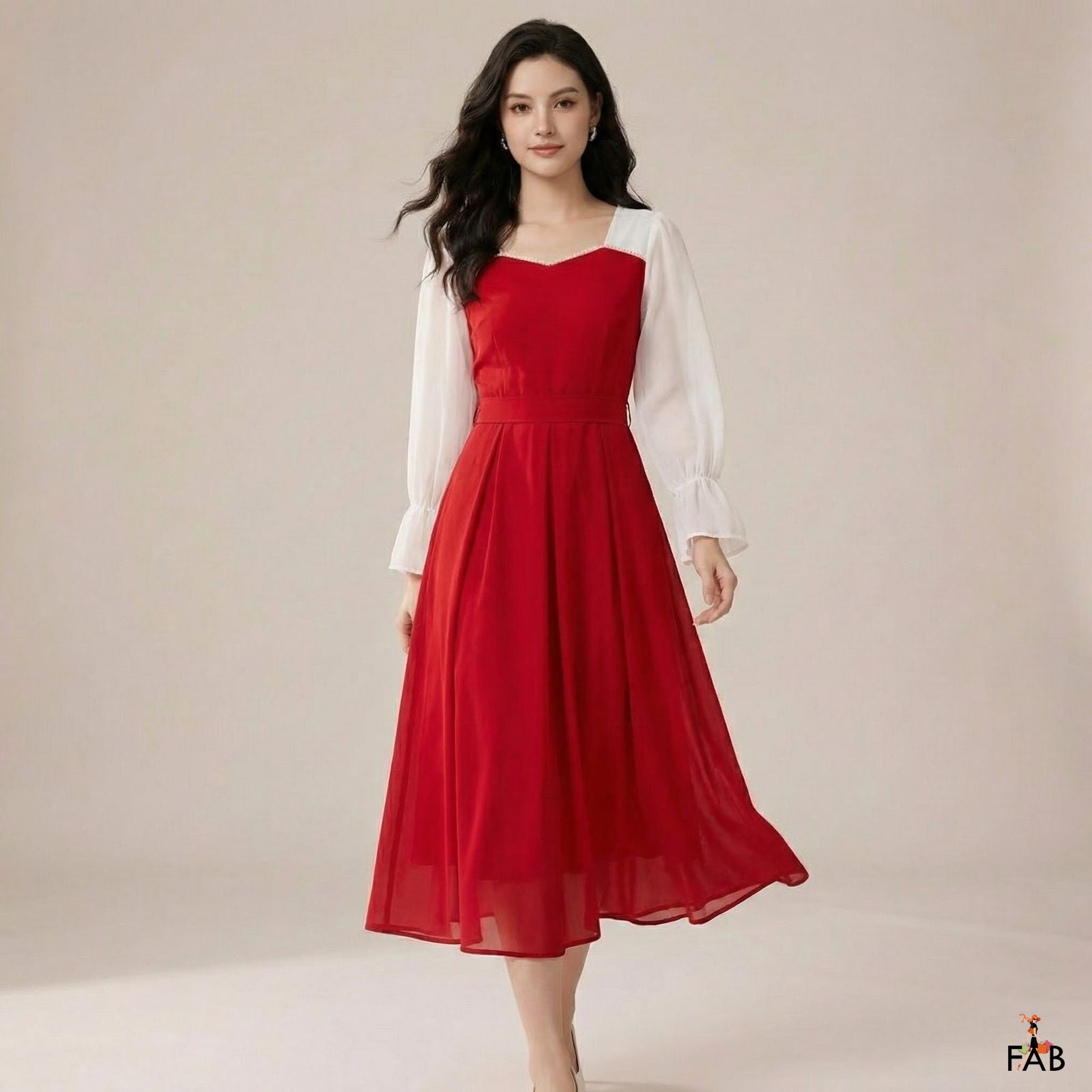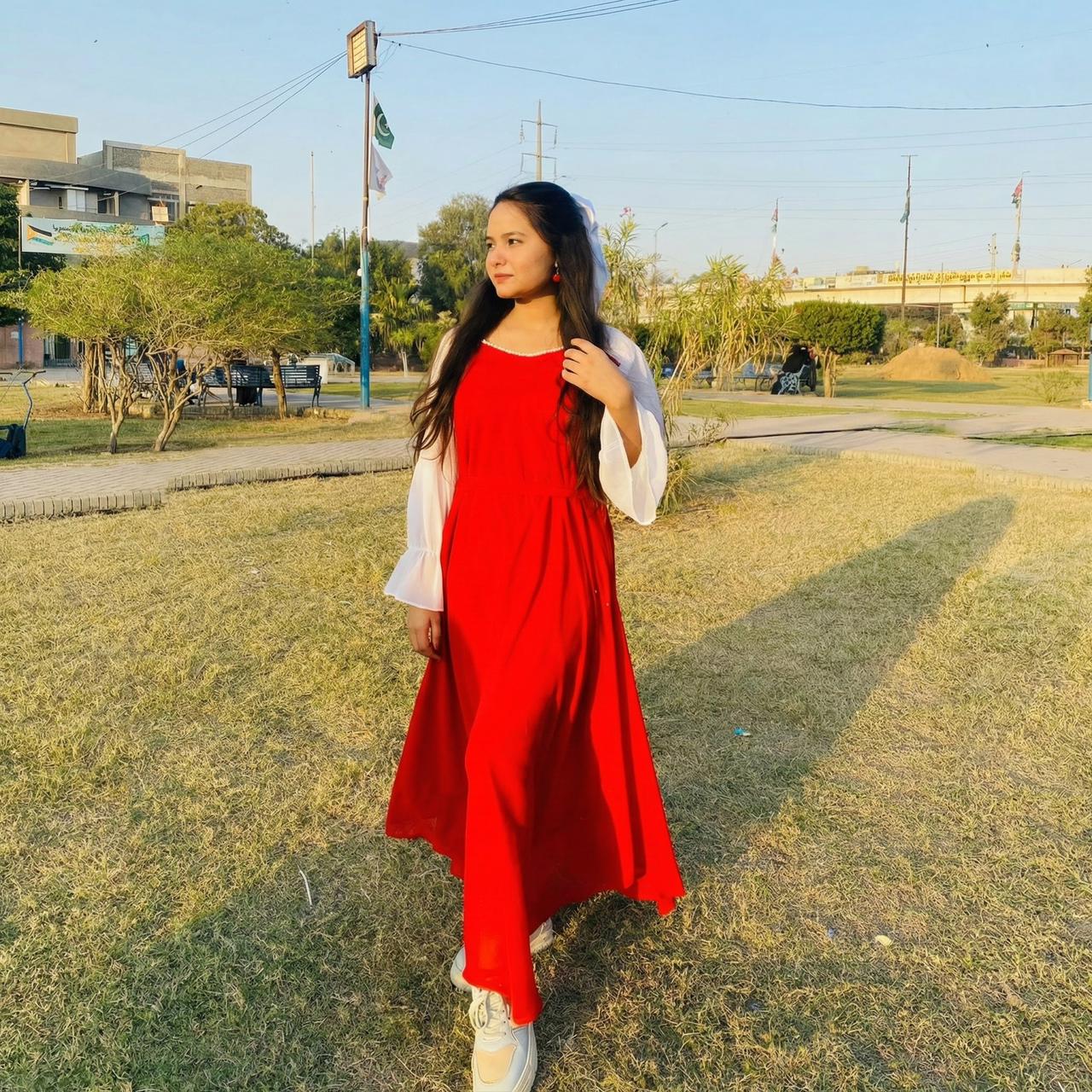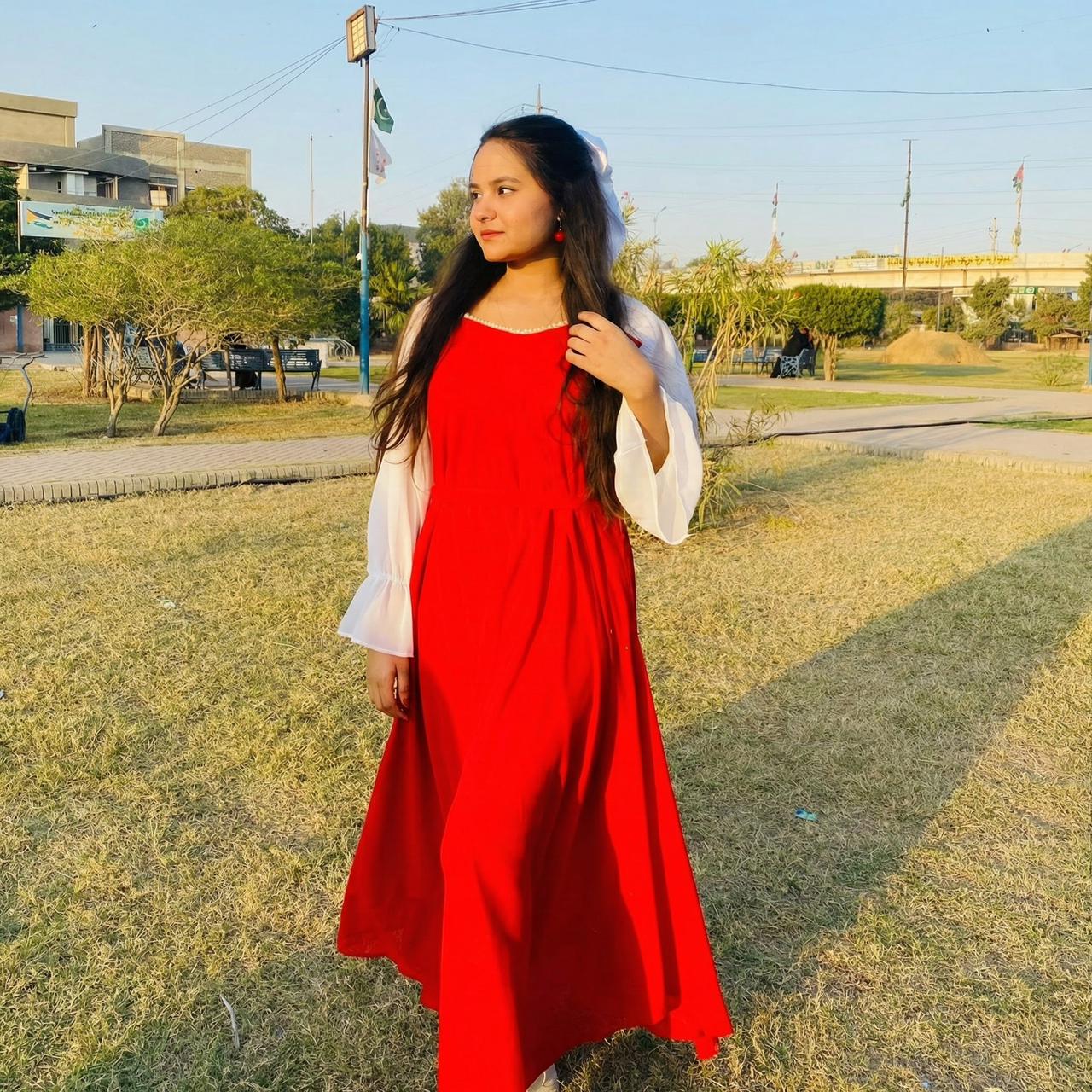 The Ruby Whisper Maxi Dress features a striking red silhouette paired with soft white chiffon sleeves, creating a perfect balance of elegance and charm. Its flowy design offers graceful movement, making it ideal for casual evenings, semi-formal events, and festive wear.